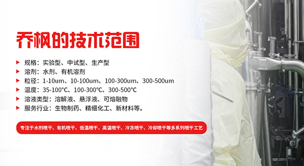 上海喬楓實業有限公司,成立于2012年,是從事噴霧干燥設備的研發設計、生產、銷售(小型噴霧干燥機,實驗型噴霧干燥機,35℃低溫噴霧干燥機,有機溶劑噴霧干燥機,低溫閉式循環噴霧干燥機超細粉末噴霧干燥機噴霧冷凍干燥機、真空噴霧干燥機、氣流噴霧干燥機噴霧造粒干燥機,離心噴霧干燥機,沸騰制粒機等)和售后于一體的綜合性公司,本公司現成為一家致力于為生物制藥、精細化工、新能源、陶瓷造粒及食品工程等領域提供全套解決方案的整線交鑰匙工程企業。